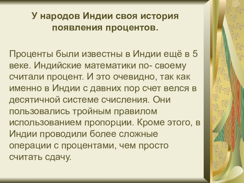 ещё в 5 веке. Индийские математики по- своему считали процент. И это очевидно, так как именно в Индии с давних пор счет велся в десятичной системе счисления. Они пользовались тройным правилом использованием пропорции. Кроме этого, в Индии проводили более сложные операции с процентами, чем просто считать сдачу.