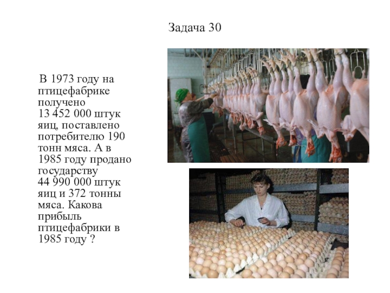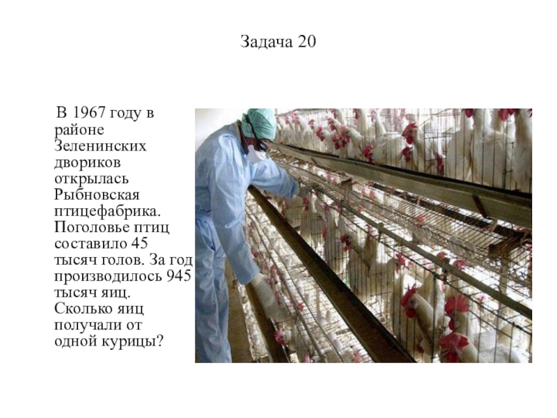 Рыбновская птицефабрика. Поголовье птиц составило 45 тысяч голов. За год производилось 945 тысяч яиц. Сколько яиц получали от одной курицы?
