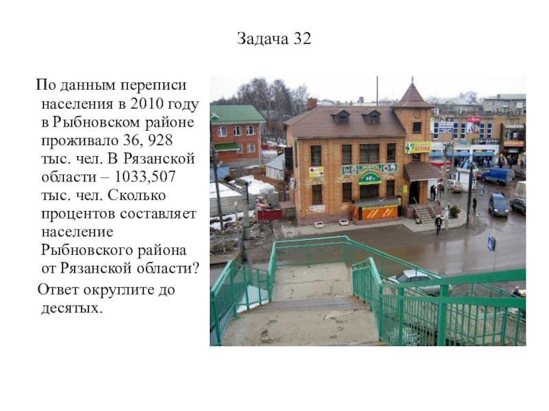 Рыбновском районе проживало 36, 928 тыс. чел. В Рязанской области – 1033,507 тыс. чел. Сколько процентов составляет население Рыбновского района от Рязанской области?