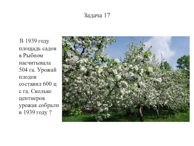 504 га. Урожай плодов составил 600 ц с га. Сколько центнеров урожая собрали в 1939 году ?