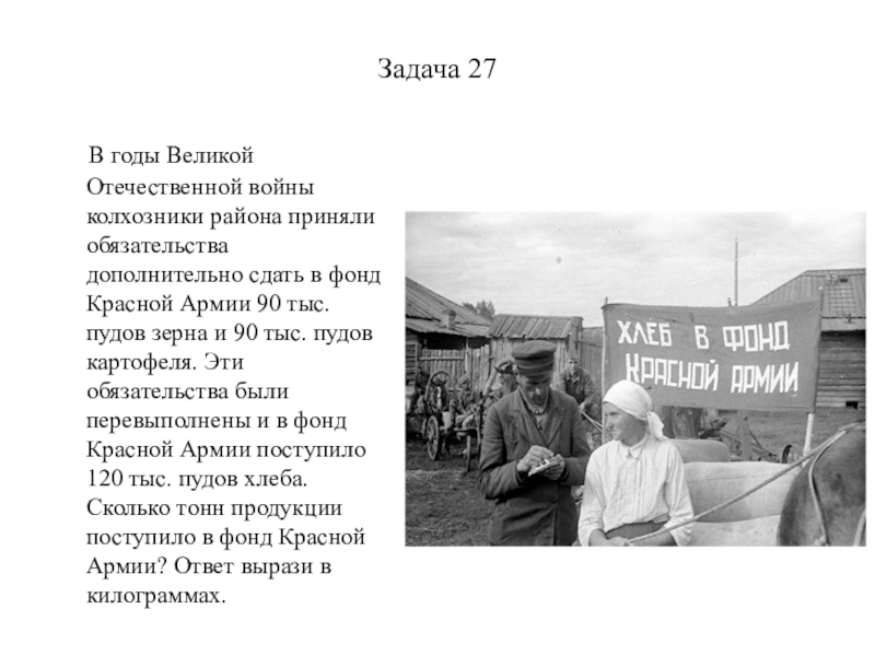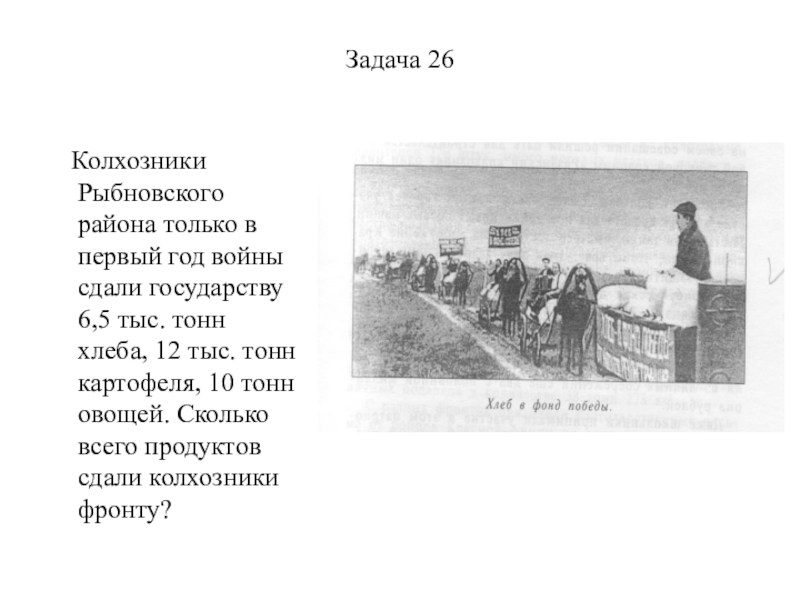 сдали государству 6,5 тыс. тонн хлеба, 12 тыс. тонн картофеля, 10 тонн овощей. Сколько всего продуктов сдали колхозники фронту?