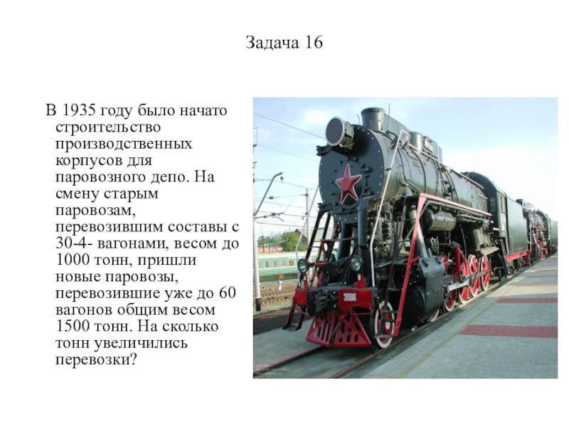 для паровозного депо. На смену старым паровозам, перевозившим составы с 30-4- вагонами, весом до 1000 тонн, пришли новые паровозы, перевозившие уже до 60 вагонов общим весом 1500 тонн. На сколько тонн увеличились перевозки?