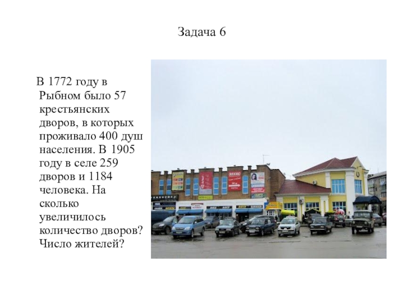 дворов, в которых проживало 400 душ населения. В 1905 году в селе 259 дворов и 1184 человека. На сколько увеличилось количество дворов? Число жителей?