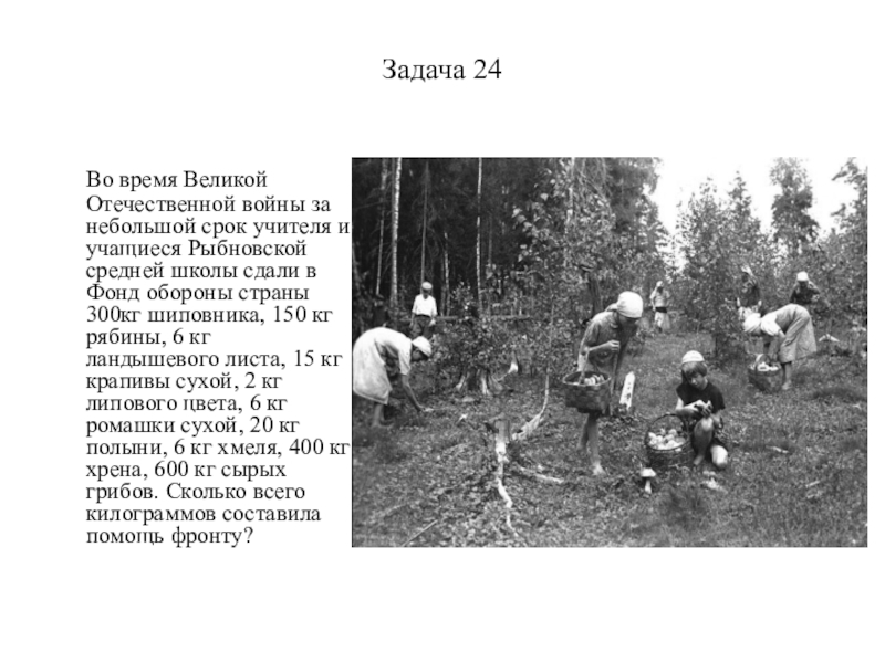 учителя и учащиеся Рыбновской средней школы сдали в Фонд обороны страны 300кг шиповника, 150 кг рябины, 6 кг ландышевого листа, 15 кг крапивы сухой, 2 кг липового цвета, 6 кг ромашки сухой, 20 кг полыни, 6 кг хмеля, 400 кг хрена, 600 кг сырых грибов. Сколько всего килограммов составила помощь фронту?