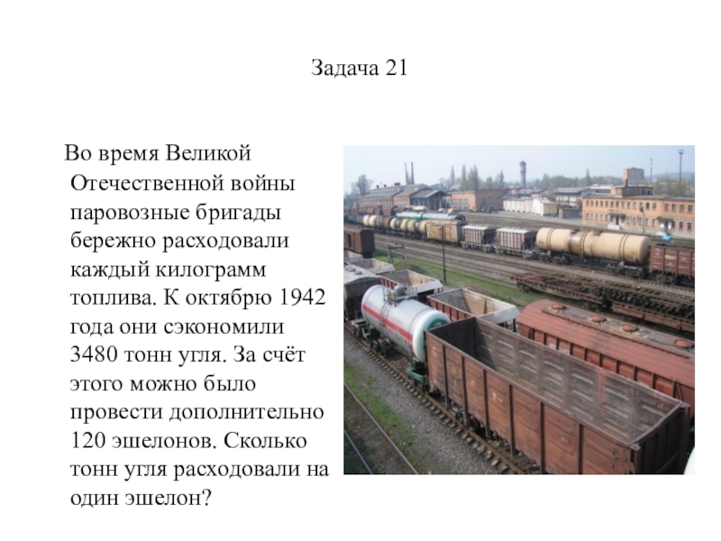 расходовали каждый килограмм топлива. К октябрю 1942 года они сэкономили 3480 тонн угля. За счёт этого можно было провести дополнительно 120 эшелонов. Сколько тонн угля расходовали на один эшелон?