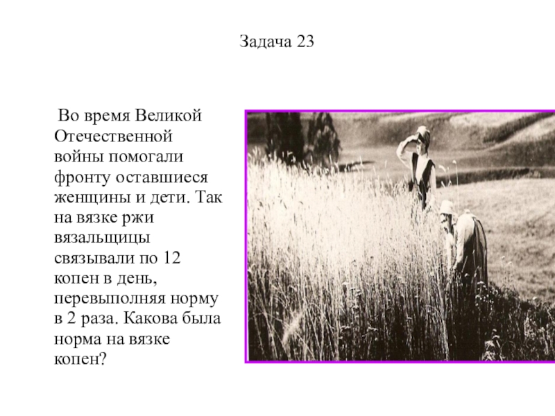 женщины и дети. Так на вязке ржи вязальщицы связывали по 12 копен в день, перевыполняя норму в 2 раза. Какова была норма на вязке копен?
