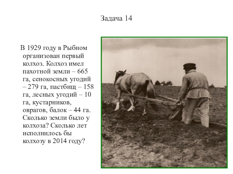 Колхоз имел пахотной земли – 665 га, сенокосных угодий – 279 га, пастбищ – 158 га, лесных угодий – 10 га, кустарников, оврагов, балок – 44 га. Сколько земли было у колхоза? Сколько лет исполнилось бы колхозу в 2014 году?
