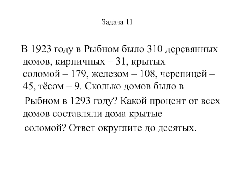 домов, кирпичных – 31, крытых соломой – 179, железом – 108, черепицей – 45, тёсом – 9. Сколько домов было в