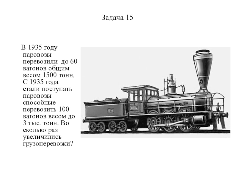 общим весом 1500 тонн. С 1935 года стали поступать паровозы способные перевозить 100 вагонов весом до 3 тыс. тонн. Во сколько раз увеличились грузоперевозки?
