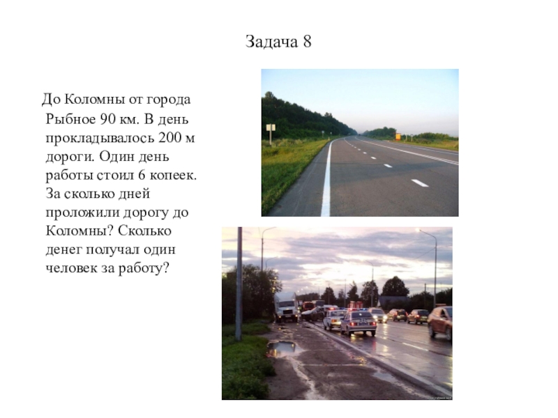 день прокладывалось 200 м дороги. Один день работы стоил 6 копеек. За сколько дней проложили дорогу до Коломны? Сколько денег получал один человек за работу?