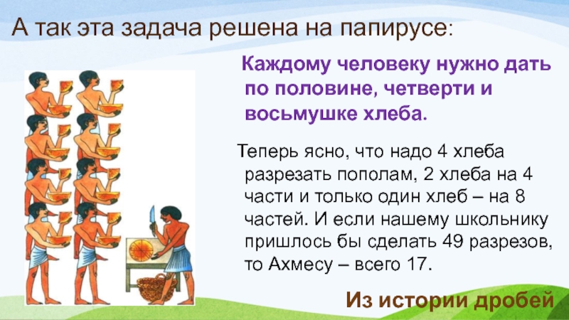 Надо разрезать каждый хлеб на 8 равных частей и каждому человеку дать по одной части от каждого хлеба.