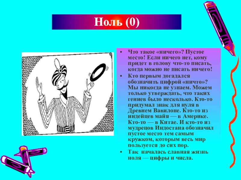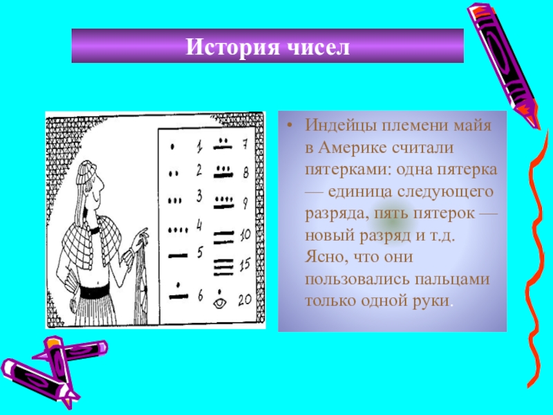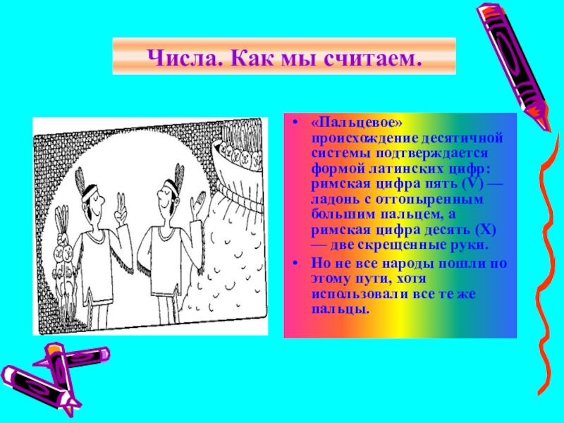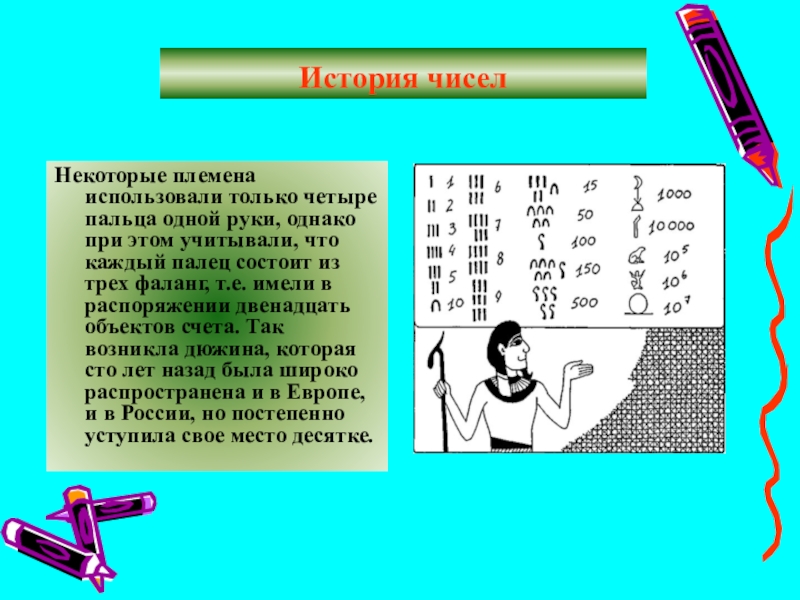 Способов счёта было придумано немало: делались зарубки на палке по числу предметов, завязывались узлы на верёвке, складывались в кучу камешки. Но палку с зарубкой с собой не возьмёшь, да и камни таскать не очень приятно, а пастуху нужно знать – не отбилась ли от стада коза.