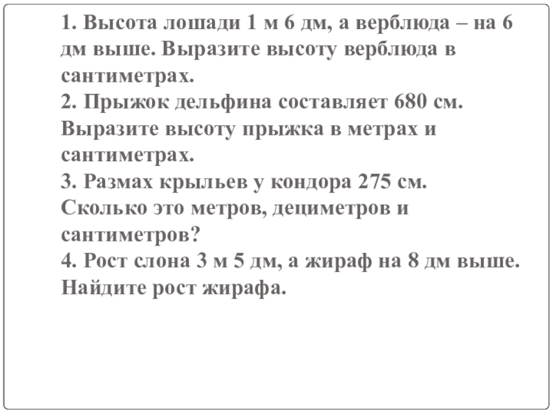 Слайд 41. Высота лошади 1 м 6 дм, а верблюда – на