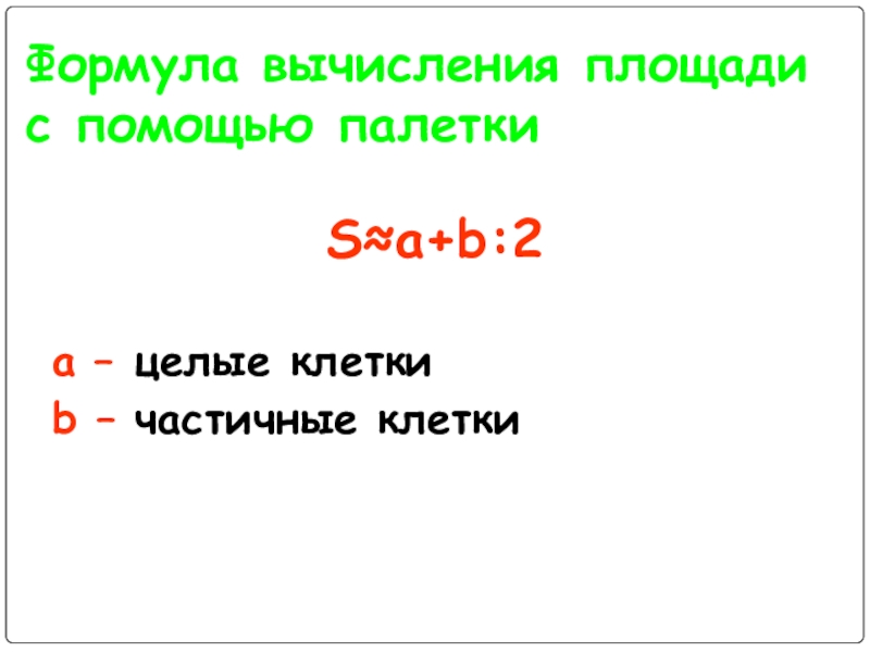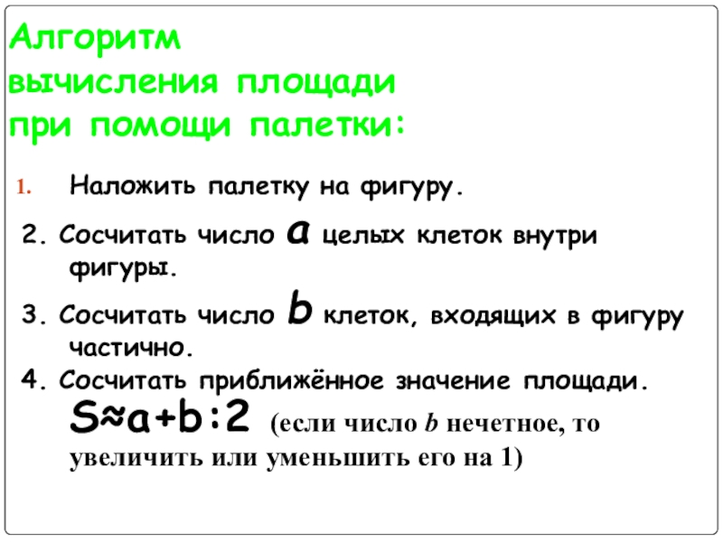 4. Сосчитать приближённое значение площади. S≈а+b:2 (если число b нечетное, то увеличить или уменьшить его на 1)
