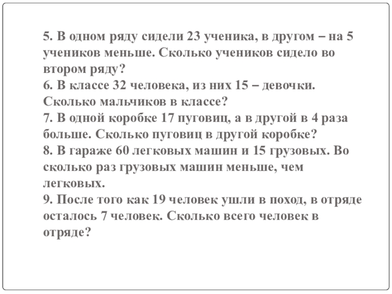 9. После того как 19 человек ушли в поход, в отряде осталось 7 человек. Сколько всего человек в отряде?