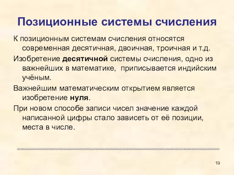 В позиционных системах счисления один и тот же числовой один и тот же числовой знак один и тот же числовой знак (цифра один и тот же числовой знак (цифра) в записи числа имеет различные значения в зависимости от того места (разряда), где он расположен.