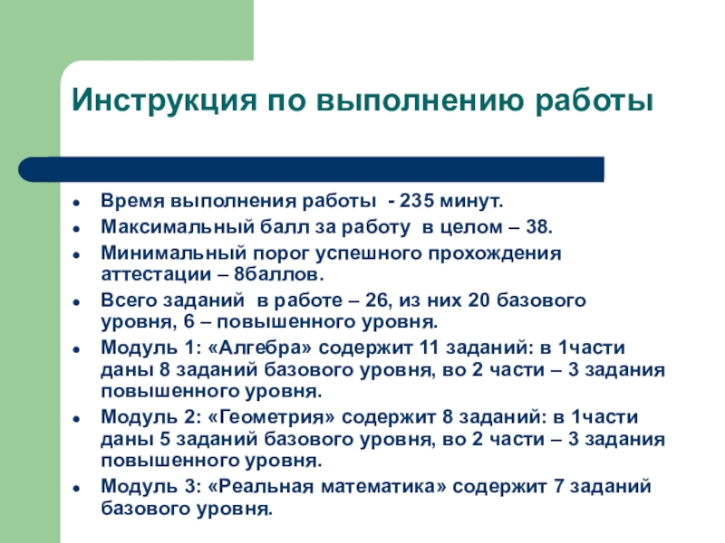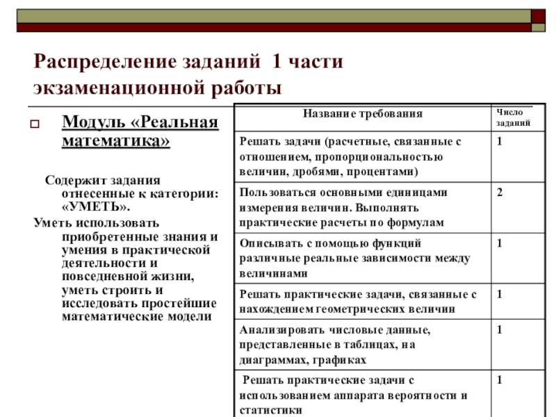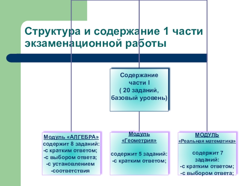 Модуль 1: «Алгебра» содержит 11 заданий: в 1части даны 8 заданий базового уровня, во 2 части – 3 задания повышенного уровня.