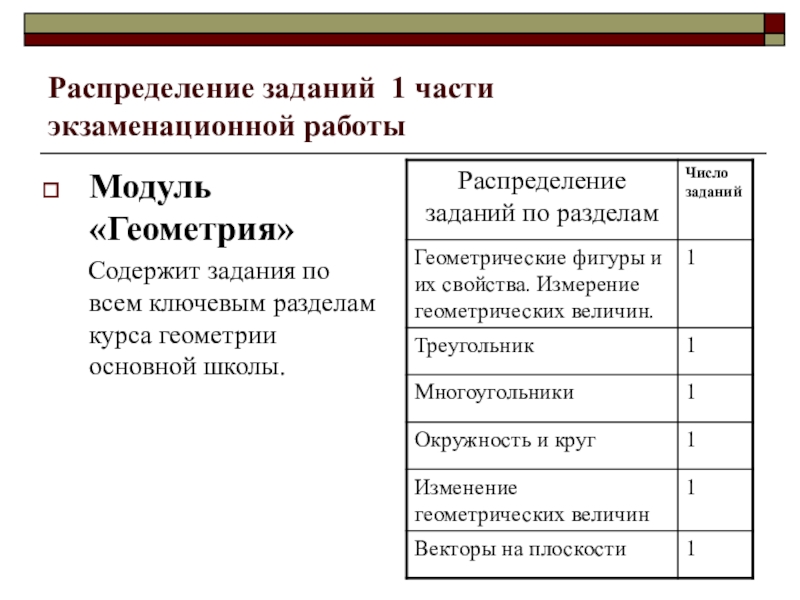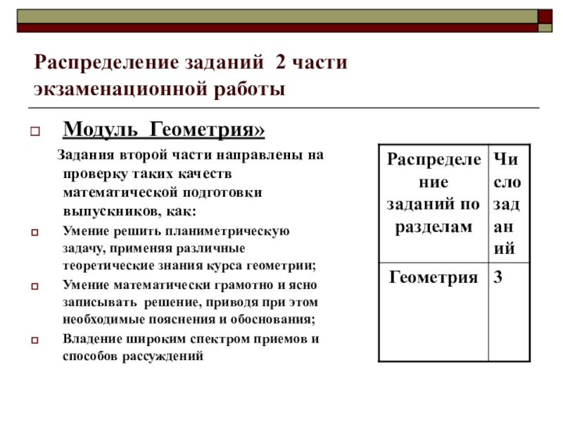 Модуль 2: «Геометрия» содержит 8 заданий: в 1части даны 5 заданий базового уровня, во 2 части – 3 задания повышенного уровня.
