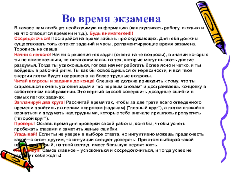 Сосредоточься! Постарайся на время забыть про окружающих. Для тебя должны существовать только текст заданий и часы, регламентирующие время экзамена. Торопись не спеша!