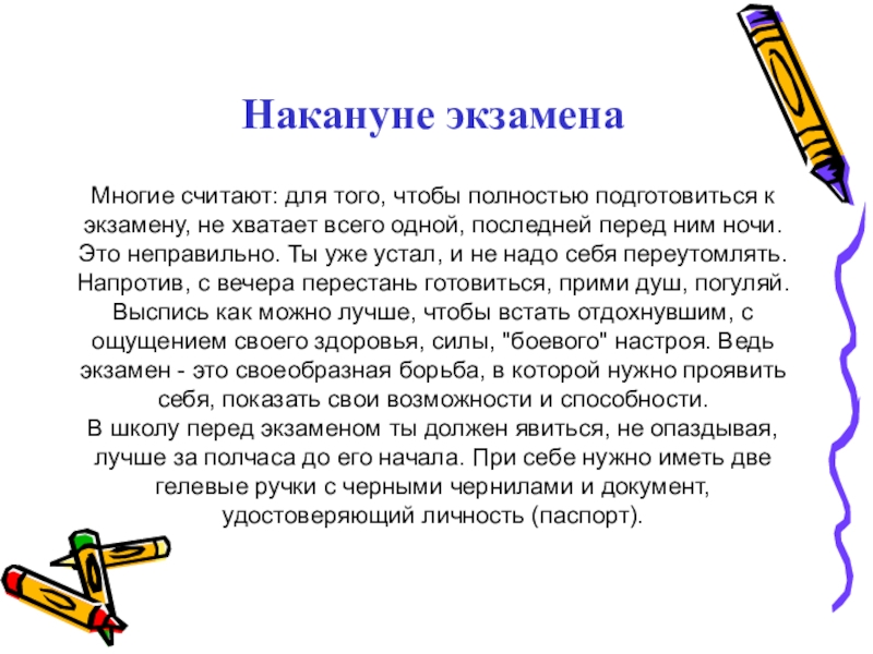 хватает всего одной, последней перед ним ночи. Это неправильно. Ты уже устал, и не надо себя переутомлять. Напротив, с вечера перестань готовиться, прими душ, погуляй. Выспись как можно лучше, чтобы встать отдохнувшим, с ощущением своего здоровья, силы, "боевого" настроя. Ведь экзамен - это своеобразная борьба, в которой нужно проявить себя, показать свои возможности и способности.