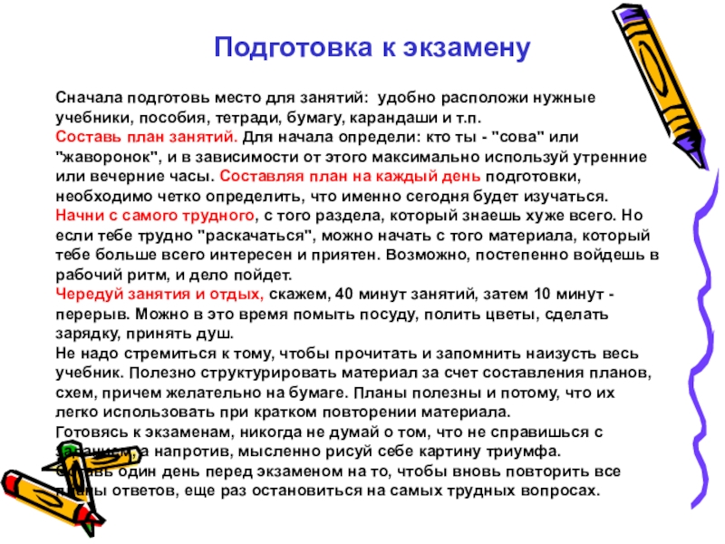 Оставь один день перед экзаменом на то, чтобы вновь повторить все планы ответов, еще раз остановиться на самых трудных вопросах.