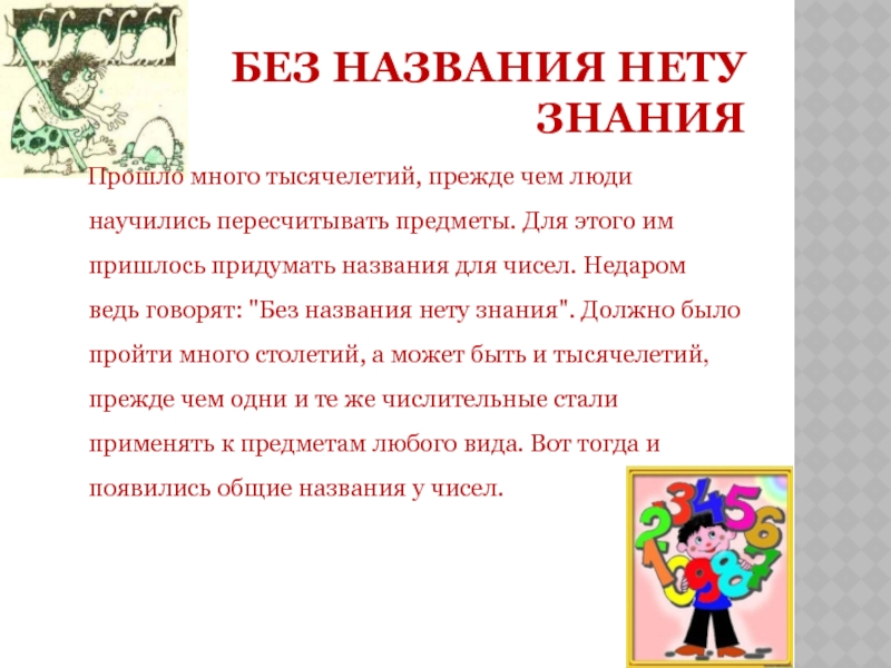 Без названия нету знания  Прошло много тысячелетий, прежде чем люди научились пересчитывать предметы. Для этого им