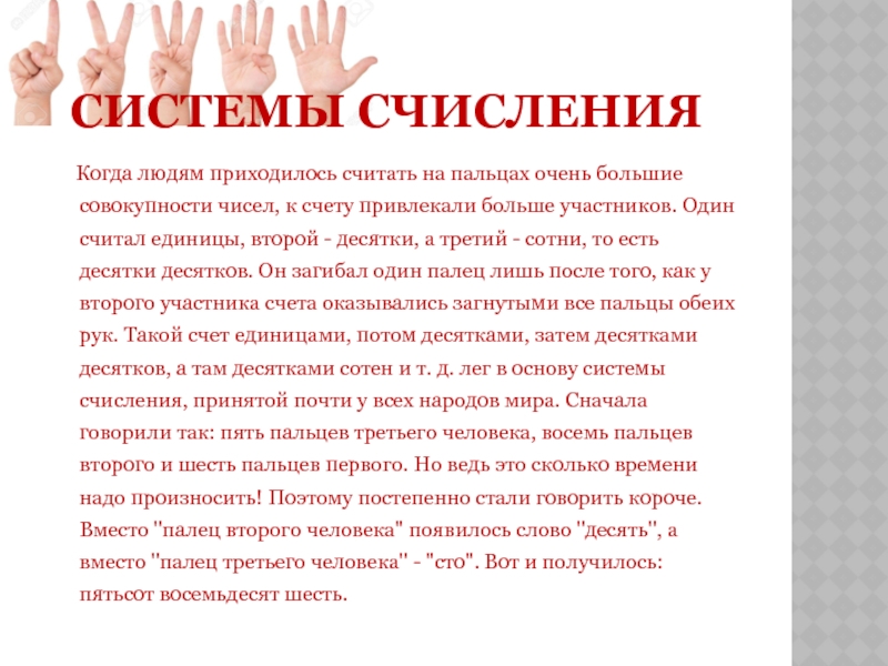 Системы счисления  Когда людям приходилось считать на пальцах очень большие совокупности чисел, к счету привлекали больше