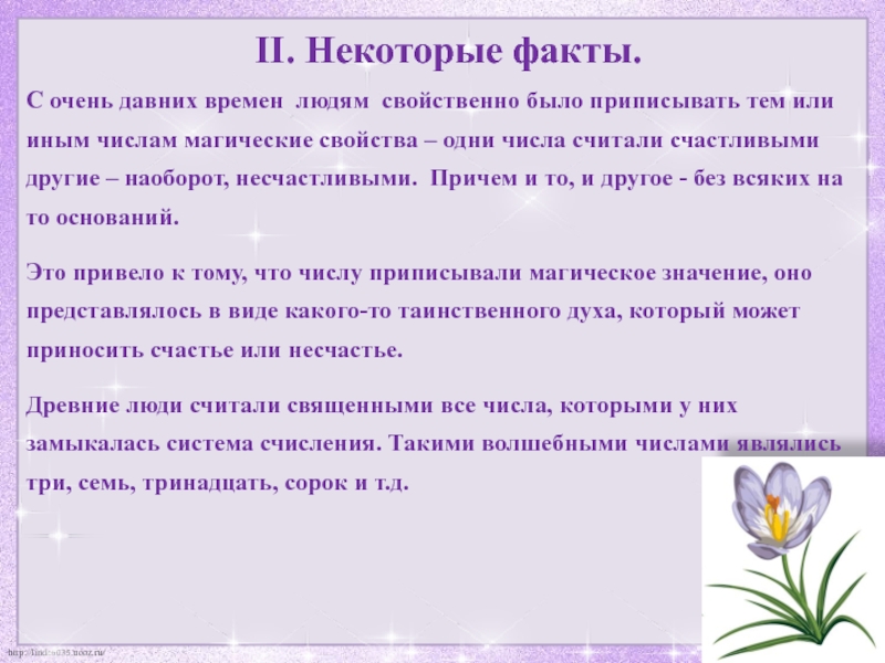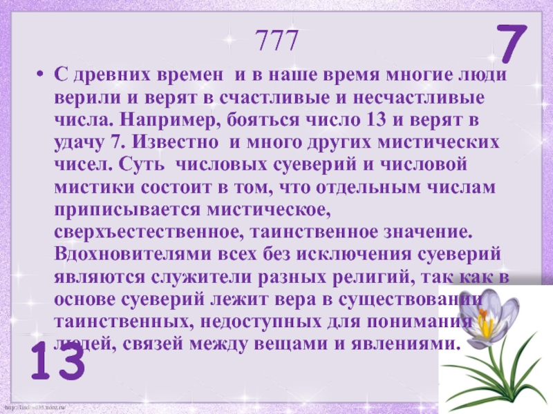 тем или иным числам магические свойства – одни числа считали счастливыми другие – наоборот, несчастливыми. Причем и то, и другое - без всяких на то оснований.