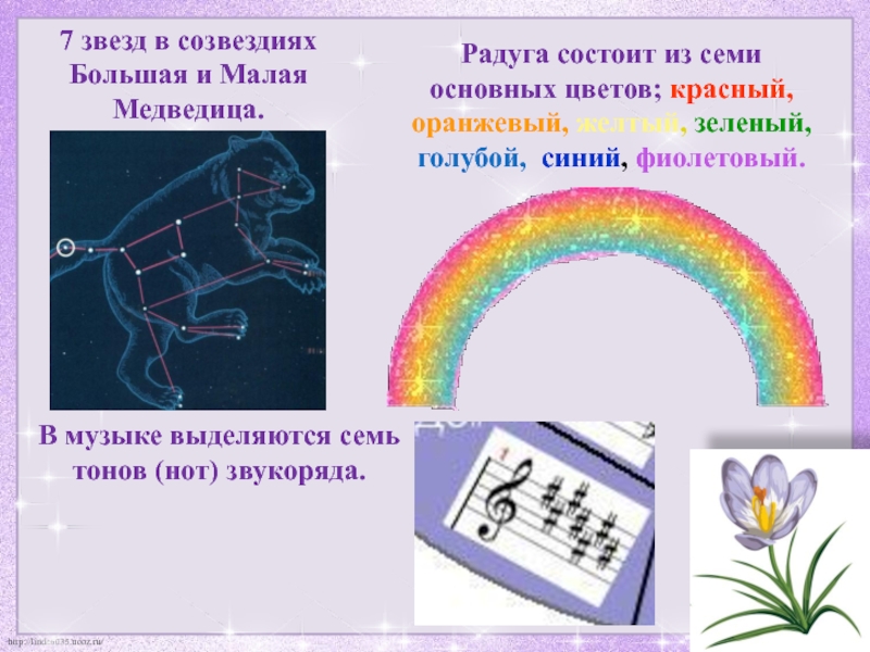 Число семь как бы «записано» в самой природе: 7 звуков в музыкальной гамме, 7 цветов радуги.