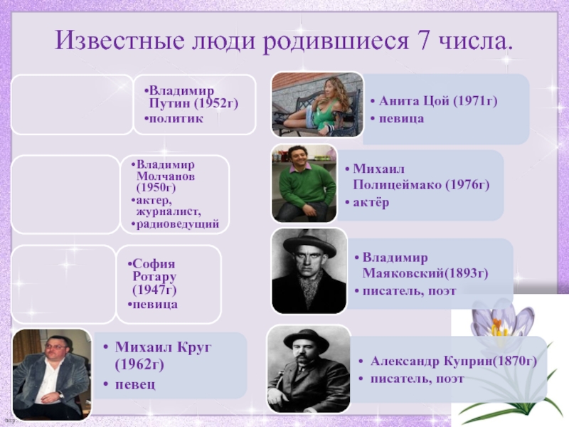 Слайд 13Известные люди родившиеся 7 числа.