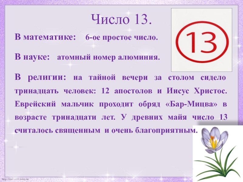 В религии: на тайной вечери за столом сидело тринадцать человек: 12 апостолов и Иисус Христос. Еврейский мальчик проходит обряд «Бар-Мицва» в возрасте тринадцати лет. У древних майя число 13 считалось священным и очень благоприятным.