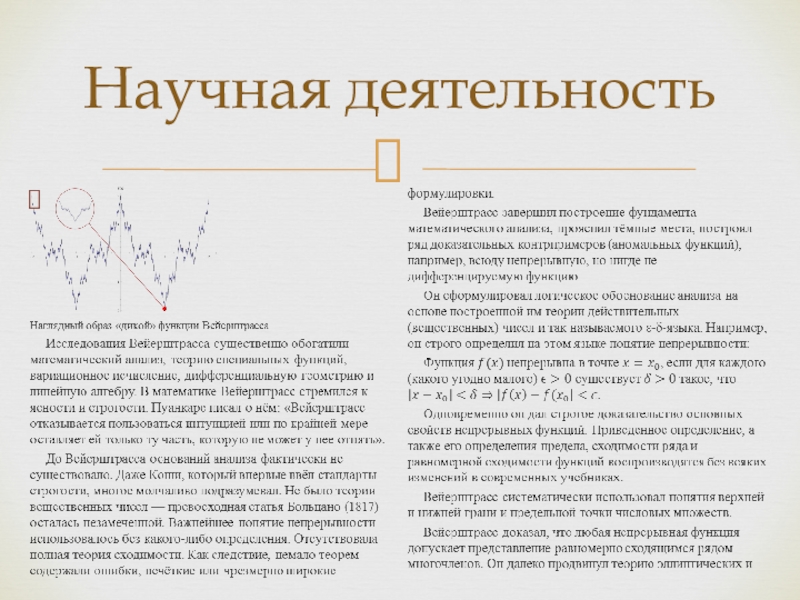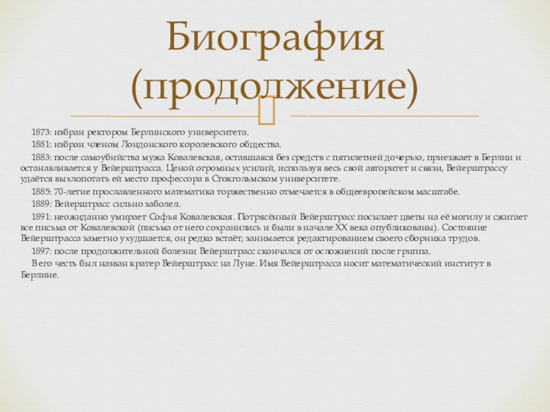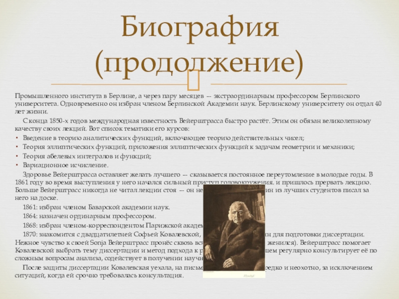 1870: знакомится с двадцатилетней Софьей Ковалевской, приехавшей в Берлин для подготовки диссертации. Нежное чувство к своей Sonja Вейерштрасс пронёс сквозь всю жизнь (он так и не женился). Вейерштрасс помогает Ковалевской выбрать тему диссертации и метод подхода к решению, в дальнейшем регулярно консультирует её по сложным вопросам анализа, содействует в получении научного признания.