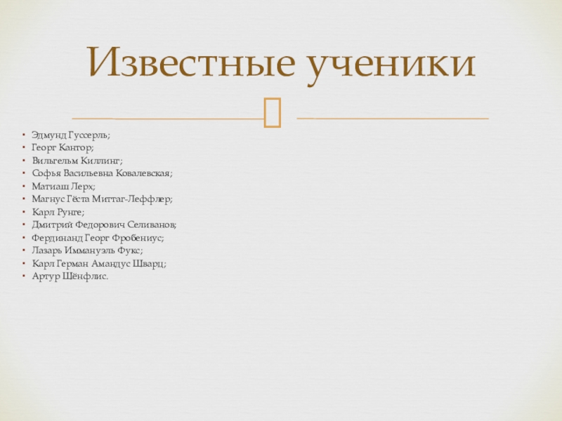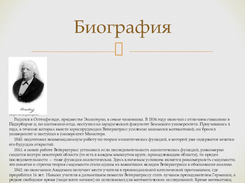 С конца 1850-х годов международная известность Вейерштрасса быстро растёт. Этим он обязан великолепному качеству своих лекций. Вот список тематики его курсов: