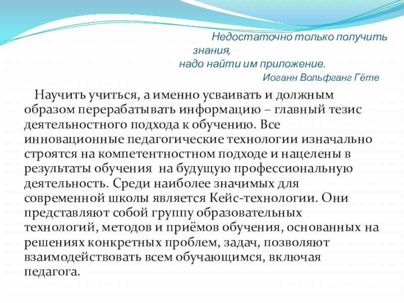 Научить учиться, а именно усваивать и должным образом перерабатывать информацию – главный тезис деятельностного подхода к обучению. Все инновационные педагогические технологии изначально строятся на компетентностном подходе и нацелены в результаты обучения на будущую профессиональную деятельность. Среди наиболее значимых для современной школы является Кейс-технологии. Они представляют собой группу образовательных технологий, методов и приёмов обучения, основанных на решениях конкретных проблем, задач, позволяют взаимодействовать всем обучающимся, включая педагога.