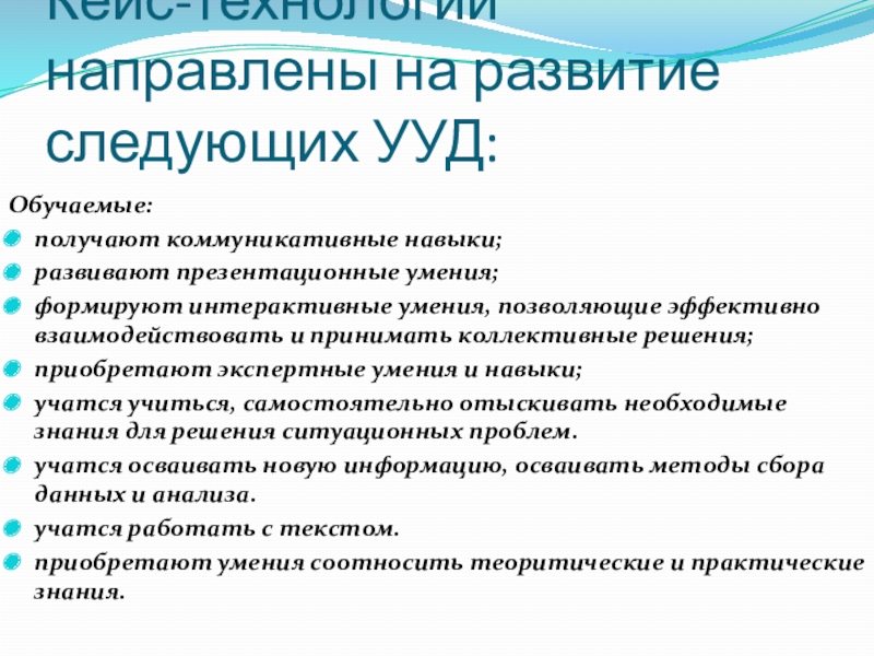 Слайд 26Кейс-технологии направлены на развитие следующих УУД: