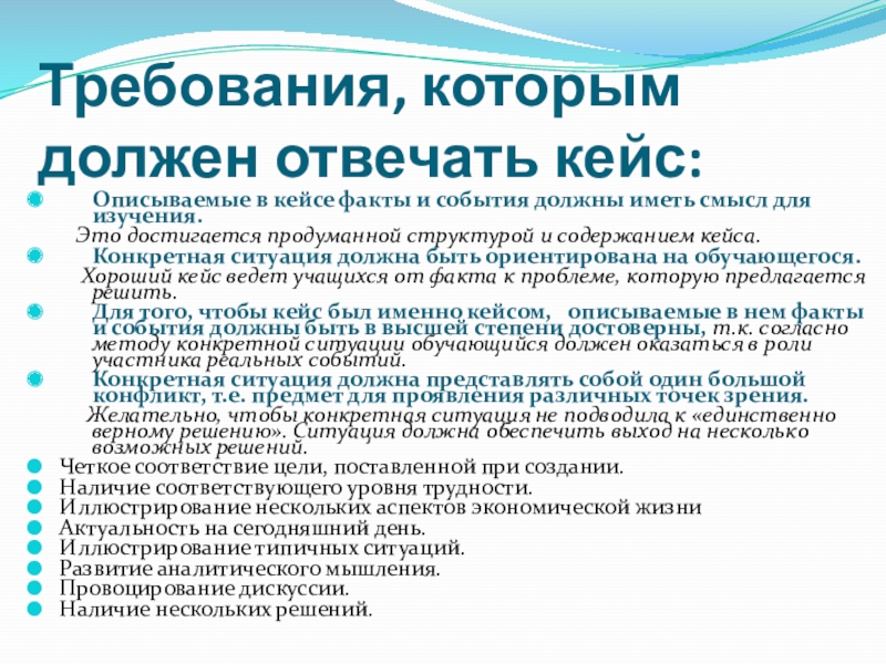 Для того, чтобы кейс был именно кейсом, описываемые в нем факты и события должны быть в высшей степени достоверны, т.к. согласно методу конкретной ситуации обучающийся должен оказаться в роли участника реальных событий.