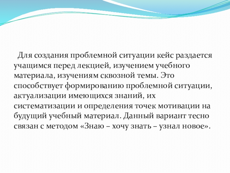 Слайд 15 Для создания проблемной ситуации кейс раздается учащимся перед лекцией, изучением