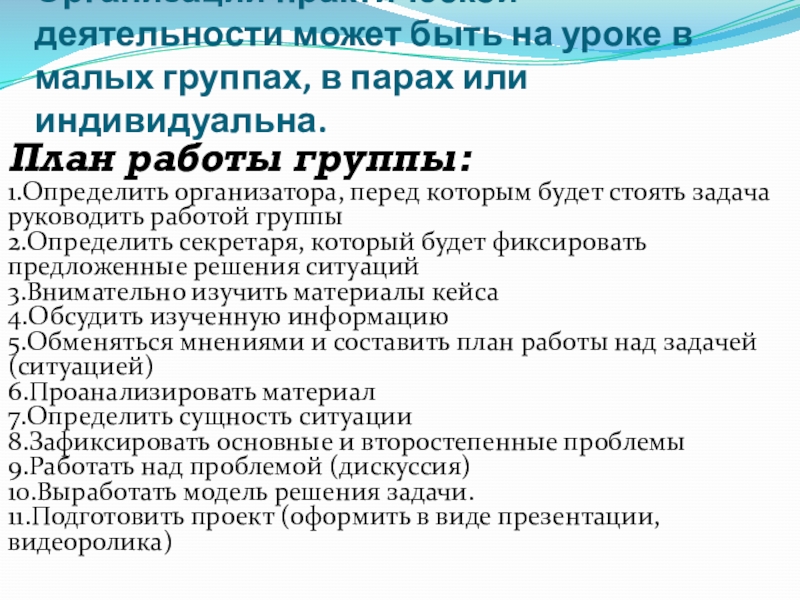 Слайд 18Организации практической деятельности может быть на уроке в малых группах, в