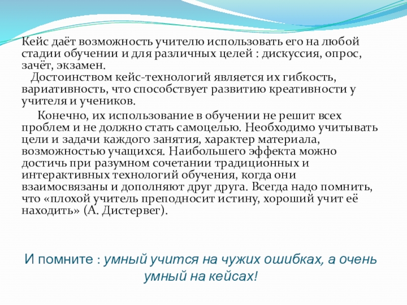 Достоинством кейс-технологий является их гибкость, вариативность, что способствует развитию креативности у учителя и учеников.