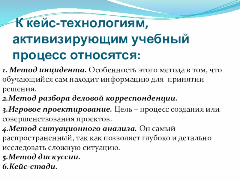 Слайд 10 К кейс-технологиям, активизирующим учебный процесс относятся: