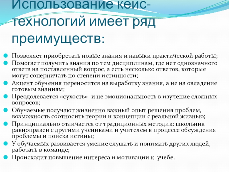Слайд 32Использование кейс-технологий имеет ряд преимуществ: