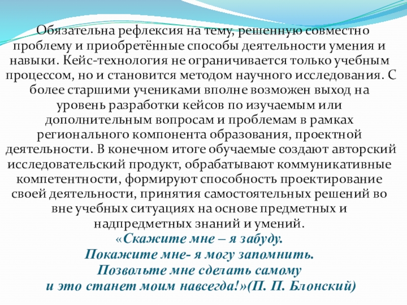деятельности умения и навыки. Кейс-технология не ограничивается только учебным процессом, но и становится методом научного исследования. С более старшими учениками вполне возможен выход на уровень разработки кейсов по изучаемым или дополнительным вопросам и проблемам в рамках регионального компонента образования, проектной деятельности. В конечном итоге обучаемые создают авторский исследовательский продукт, обрабатывают коммуникативные компетентности, формируют способность проектирование своей деятельности, принятия самостоятельных решений во вне учебных ситуациях на основе предметных и надпредметных знаний и умений.