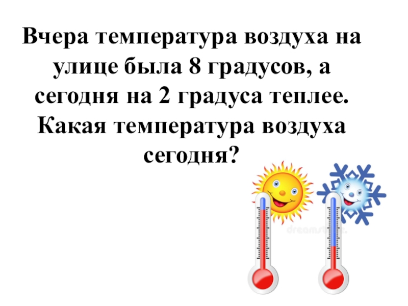 Вчера температура воздуха на улице была 8 градусов, а сегодня на 2 градуса теплее. Какая температура воздуха