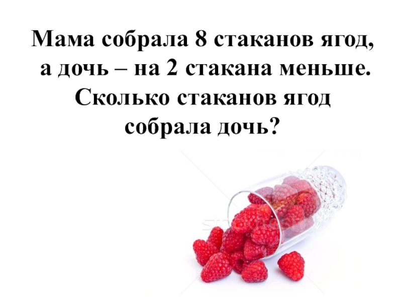 Мама собрала 8 стаканов ягод, а дочь – на 2 стакана меньше. Сколько стаканов ягод собрала дочь?