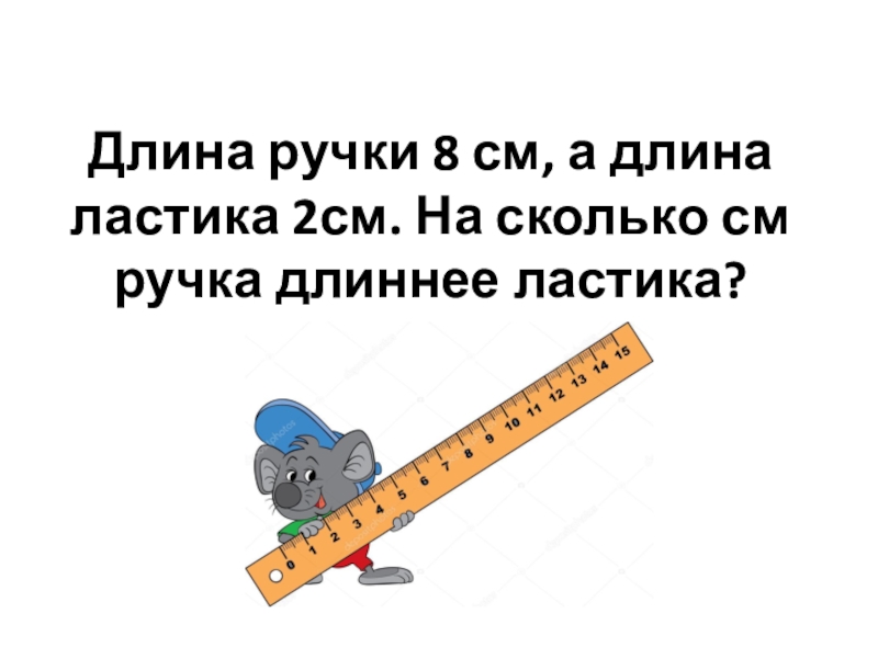 Слайд 5Длина ручки 8 см, а длина ластика 2см. На сколько см