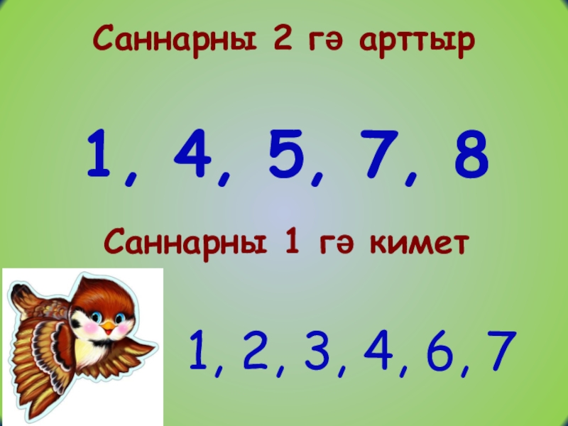 Саннарны 2 гә арттыр1, 4, 5, 7, 8Саннарны 1 гә кимет 1, 2, 3, 4, 6, 7