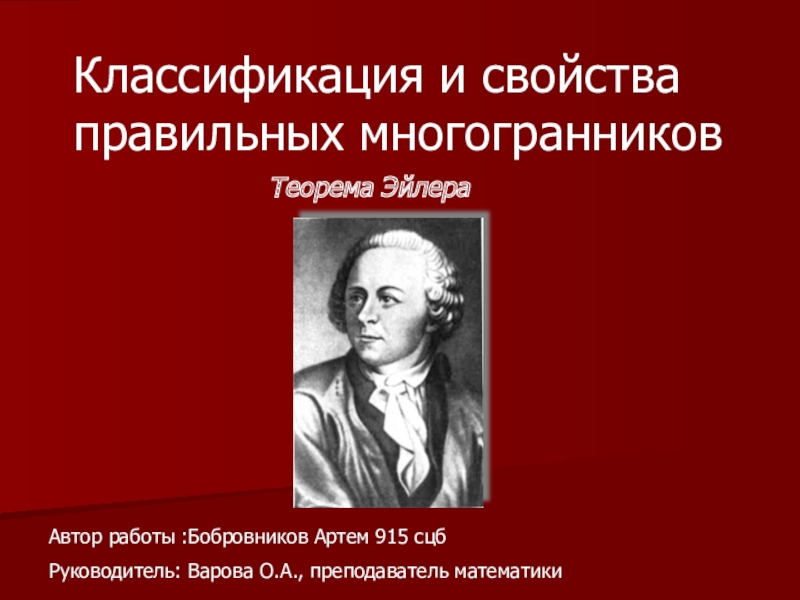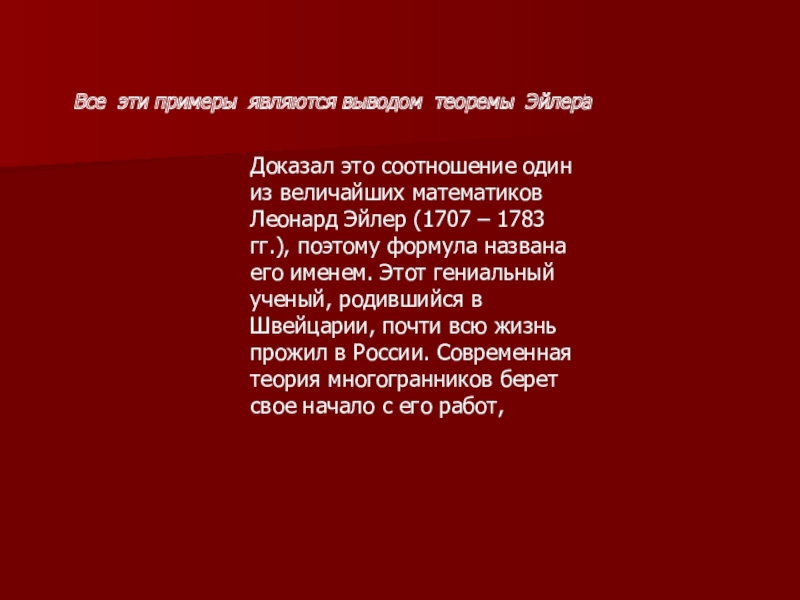 1783 гг.), поэтому формула названа его именем. Этот гениальный ученый, родившийся в Швейцарии, почти всю жизнь прожил в России. Современная теория многогранников берет свое начало с его работ,