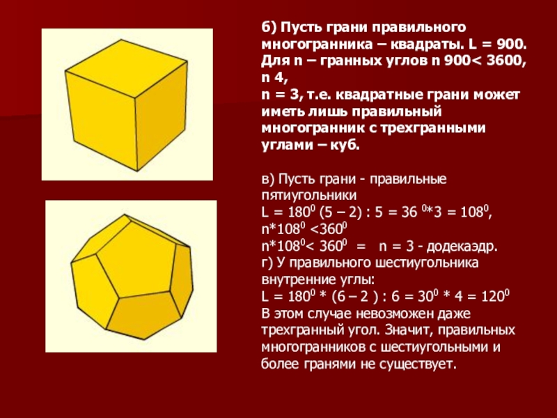 Слайд 4б) Пусть грани правильного многогранника – квадраты. L = 900.