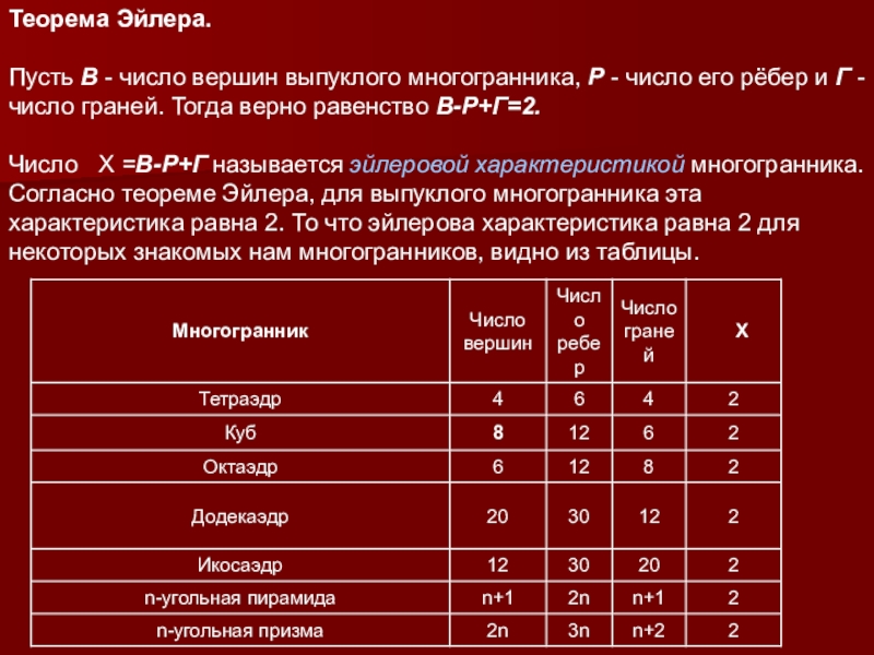 Число X =В-Р+Г называется эйлеровой характеристикой многогранника. Согласно теореме Эйлера, для выпуклого многогранника эта характеристика равна 2. То что эйлерова характеристика равна 2 для некоторых знакомых нам многогранников, видно из таблицы.