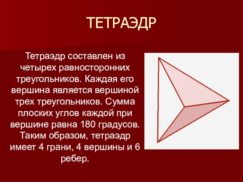 трех треугольников. Сумма плоских углов каждой при вершине равна 180 градусов. Таким образом, тетраэдр имеет 4 грани, 4 вершины и 6 ребер.